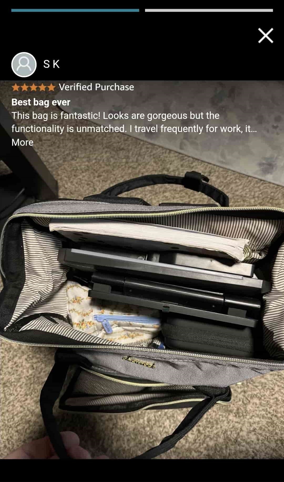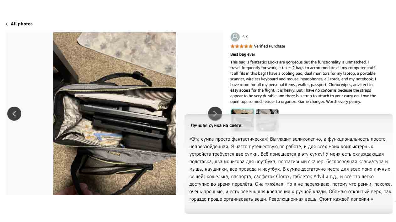 Эта сумка просто фантастическая! Выглядит великолепно, а функциональность просто непревзойденная. Я часто путешествую по работе, и для всех моих компьютерных устройств требуется две сумки. Всё помещается в эту сумку! У меня есть охлаждающая подставка, два монитора для ноутбука, портативный сканер, беспроводная клавиатура и мышь, наушники, все провода и ноутбук. В сумке достаточно места для всех моих личных вещей: кошелька, паспорта, салфеток Clorox, таблеток Advil и т.д., и всё это легко доступно во время перелёта. Она тяжёлая! Но я не переживаю, потому что ремни, похоже, очень прочные, и есть ремень для крепления к ручной клади. Обожаю открытый верх, так гораздо проще организовать вещи. Революционная вещь. Стоит каждой копейки.